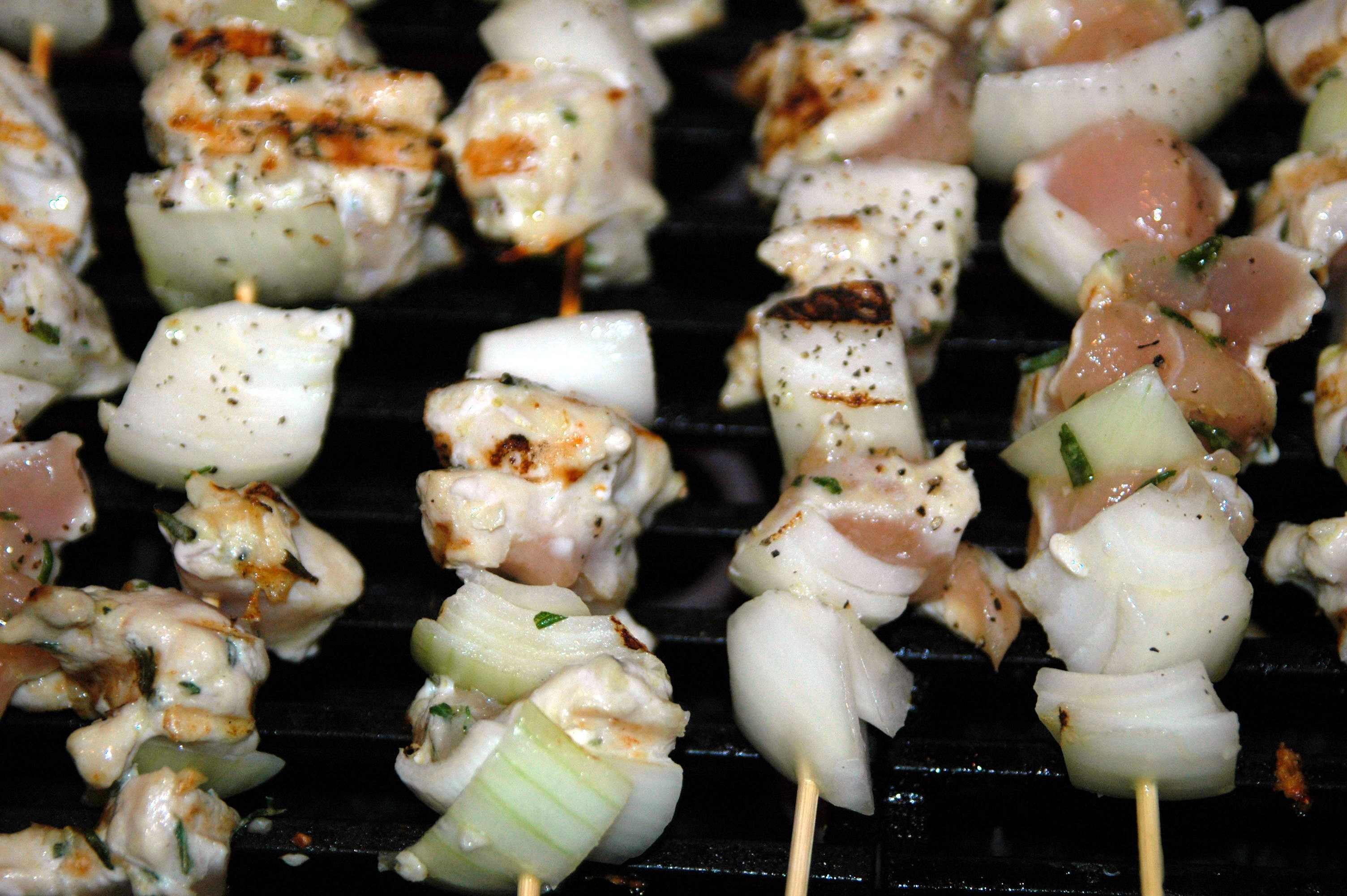 - Assemble the skewers, alternating chicken with small chunks of onion.