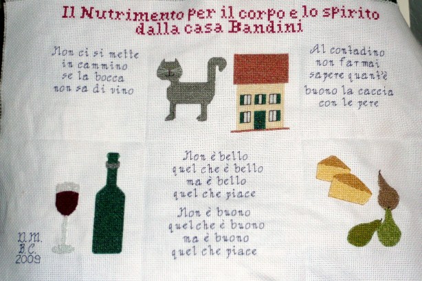Al contadino non far mai sapere quant’e` buono la caccia con le pere. “Don’t ever let the farmer know how good cheese is with pears.” Because then he’ll eat it all himself and you’ll never get to taste it! In this case, we accidentally wrote caccia (meat) instead of cacio (cheese.) Ooops. Our host dad assured us that this error is what made the cross-stitch more special.