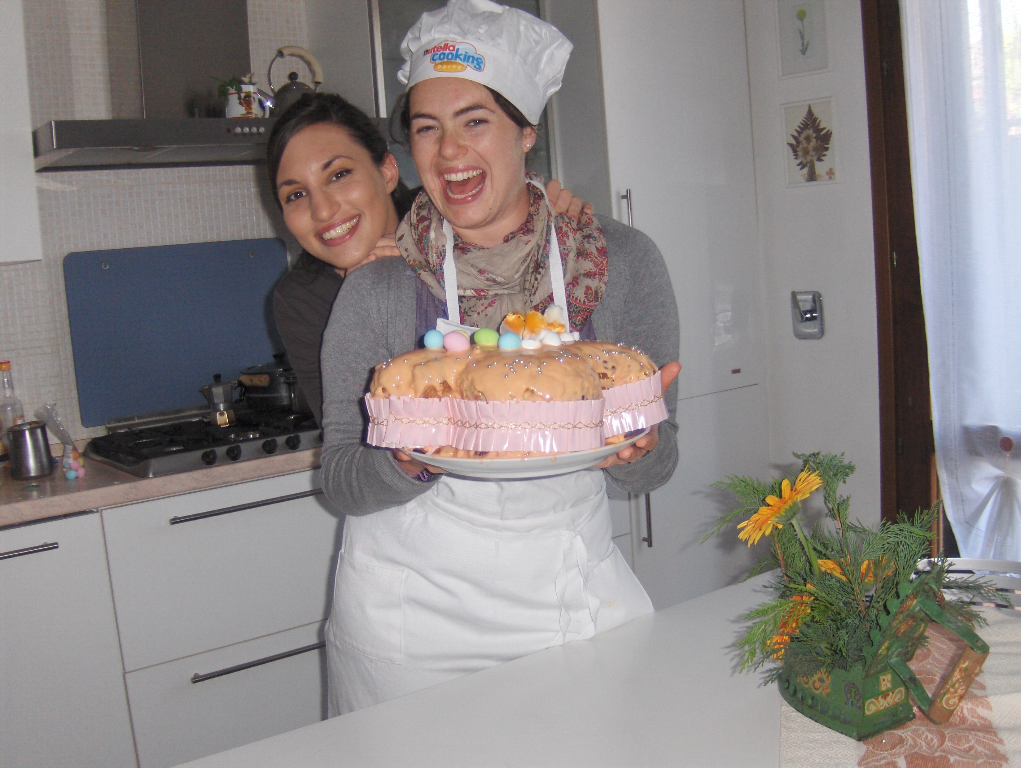 Last weekend, I was lucky enough to get a cooking lesson from Dea, my friend Elisa’s mom, who is a wonderful cook. She taught me how to make a colombo cake. The colombo is a typical Italian Easter bread, light, fluffy, and studded with candied fruit and almonds. We whipped egg yolks with mascarpone and sugar to make a custardy filling for a store-bought colombo, which we sliced in half. Then we combined egg whites, colored sugar, and a bit of the mascarpone mixture to make a colorful glaze for the bread, which was delicious!