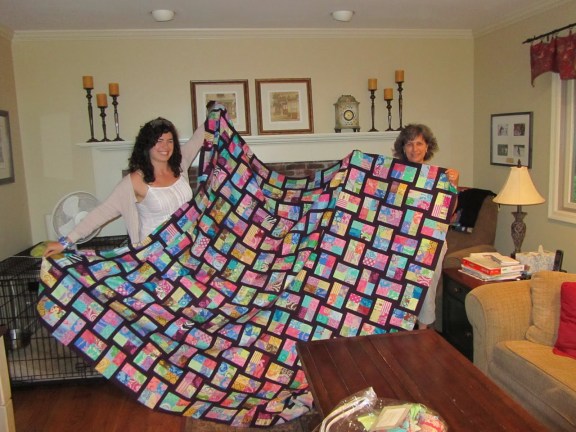 Last weekend, I met up with my fabulous mom for a QUILTING RETREAT in Connecticut! Since I came back from Italy, my mom and I had been working really hard on a queen-size quilt (the third quilt we’ve done together). We used mostly Jennifer Paganelli fabric scraps to create a riot of colors that truly exemplify the pattern’s name “Gemstones.” Despite all of our labors, the day of my departure for New York City arrived and we had not yet assembled the quilt top. After my mom carried me kicking and screaming away from the sewing machine and into the minivan for the long drive across New York State, I reluctantly left the quilt’s scattered pieces behind me. (Yes, the first part of that sentence is an exaggeration, but in the days before I left home, I devoted an unhealthy part of my “packing time” to “quilting time.” And on the day of my move-out, I was drinking my coffee, as had become my routine, at the sewing machine…when my mom came in and kicked me out!)