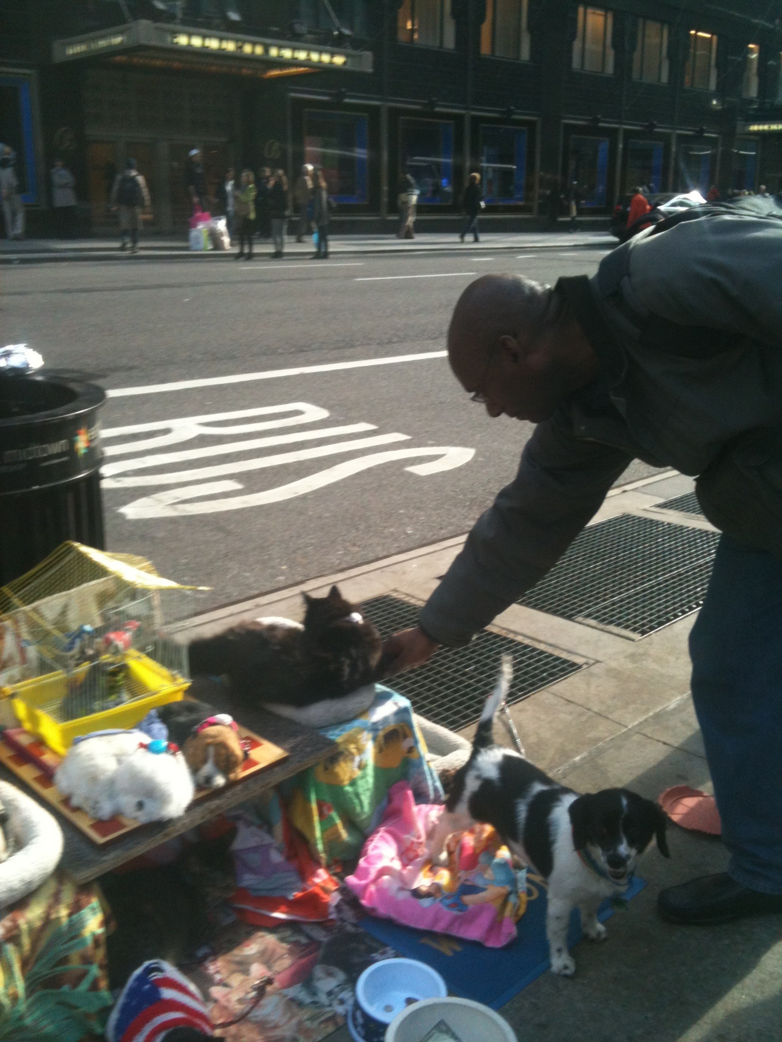Sure enough, just a few moments later, the old man arrived. It appears that he is not trying to sell the pets, just display them to earn more donations in their food bowls. Not a bad idea.