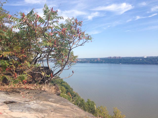 In Palisades Park, New Jersey, leaves crunch underfoot, and hawks circle overhead. At the overlook, a sheer cliff face drops down to the Hudson. Across the river, you can see as far east as the World’s Fair Globe in Queens, as far north as Yonkers, and as far south as Brooklyn. A pictorial sign points out recognizable landmarks.